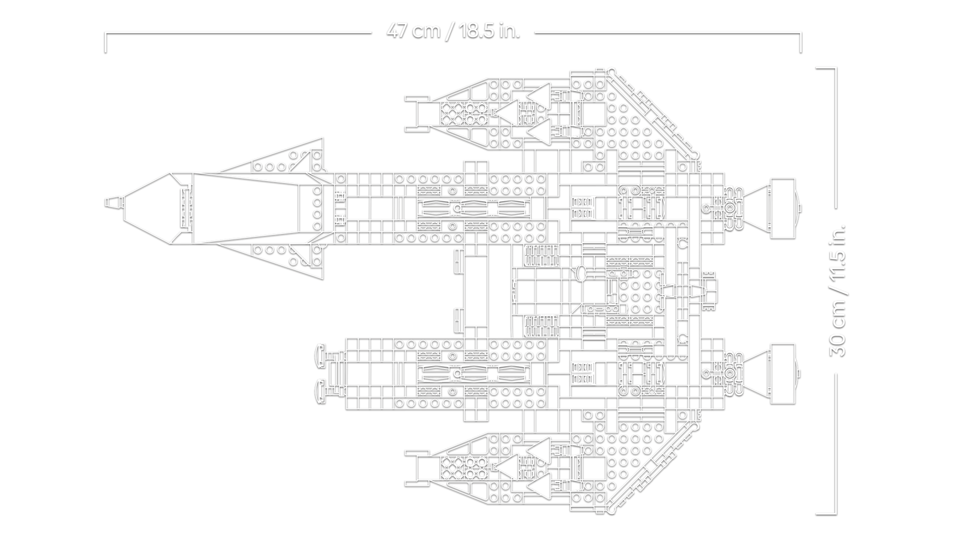 - Dimensions – The Blacktron Renegade spaceship in this 1,151-piece building set measures over 9 cm (3.5 in.) high, 47 cm (18.5 in.) long and 30 cm (11.5 in.) wide