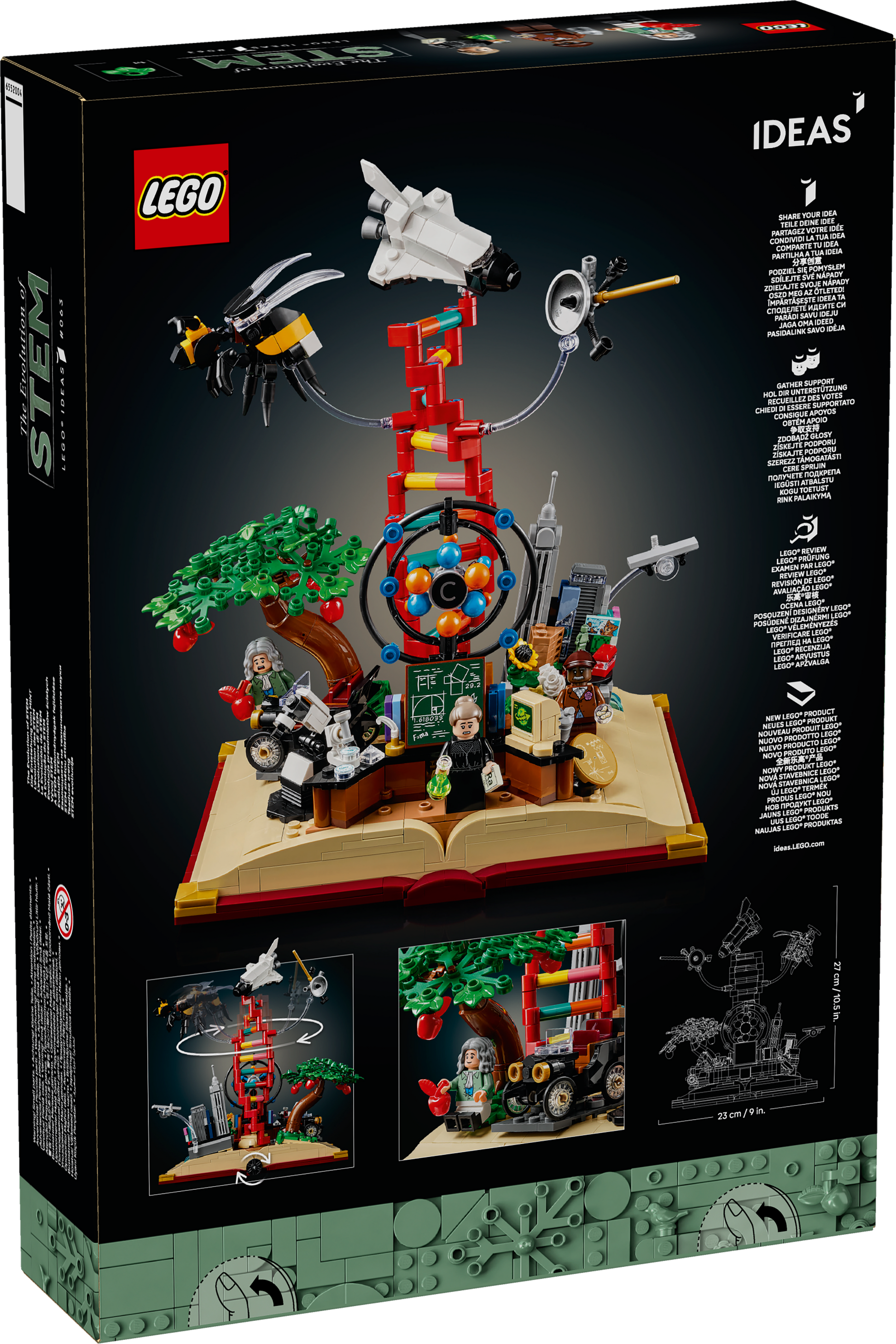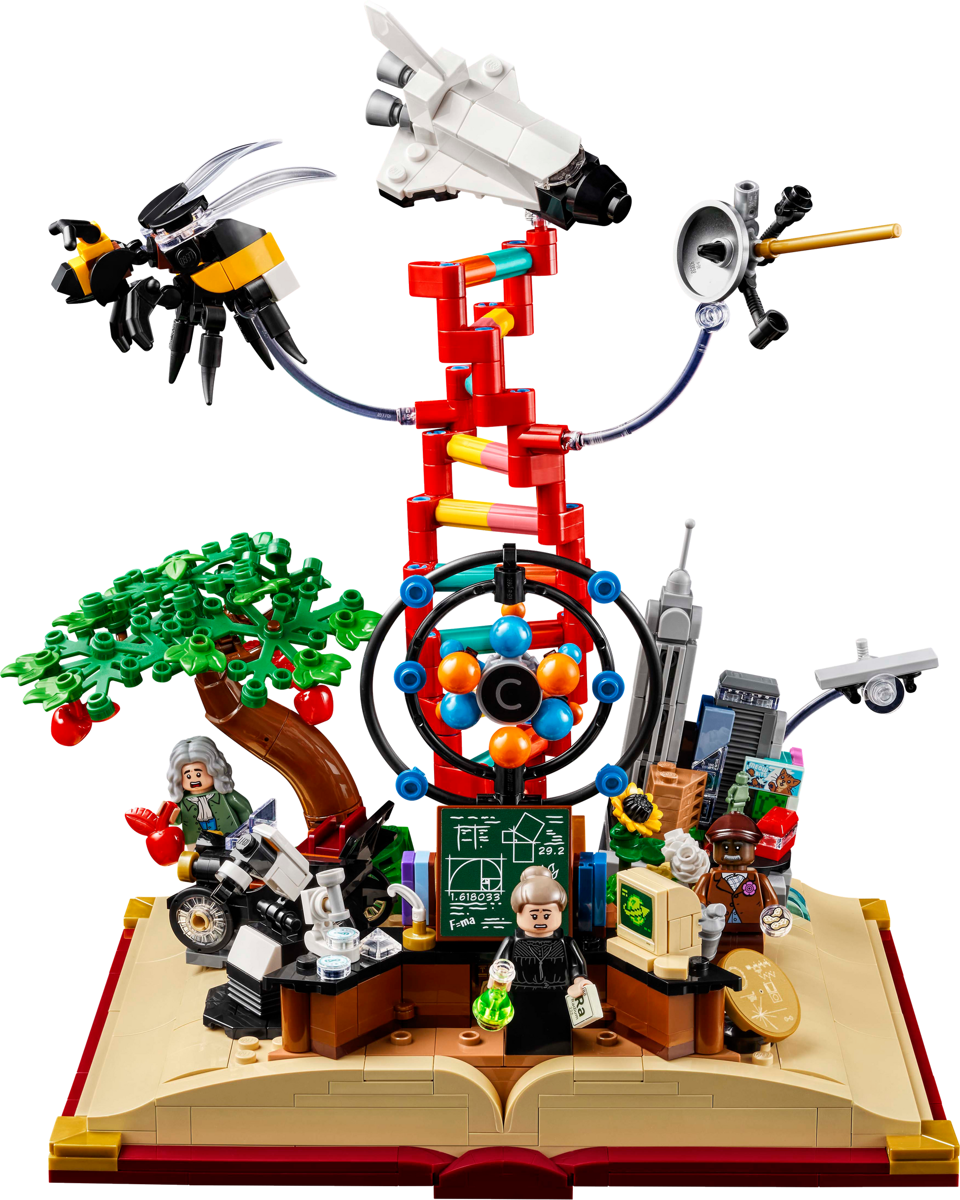 - Collectible display model for adults – A buildable base shaped like an open book is topped with many mini builds including Newton’s apple tree, Carver’s plants bed, a space shuttle and a robotic arm