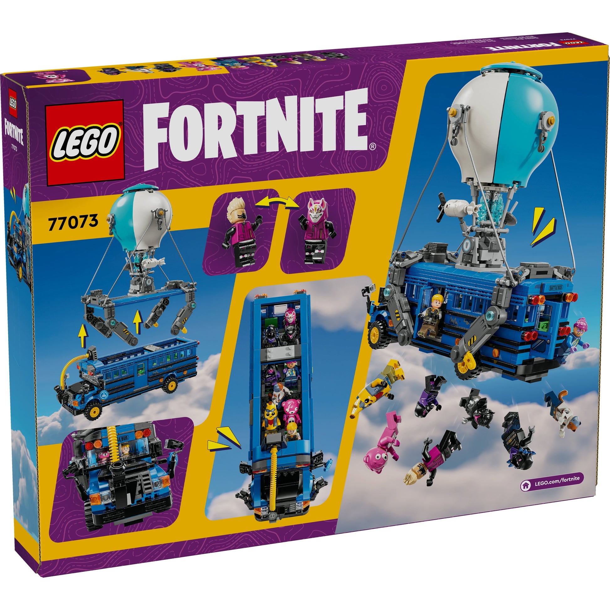Fans journey into the exciting LEGO Fortnite world as they build the bus, which has rolling wheels and a removable roof, and the instantly recognisable hot-air balloon. But that’s just the start! Once the bus is complete, they’ll delight in discovering iconic accessories such as Slurp Juice, a Grappler, Pickaxes and Slap Juice, as well as 9 minifigures of iconic Fortnite outfits. Bringing the adventure to life, these can be seated inside the bus to fuel creative role play.