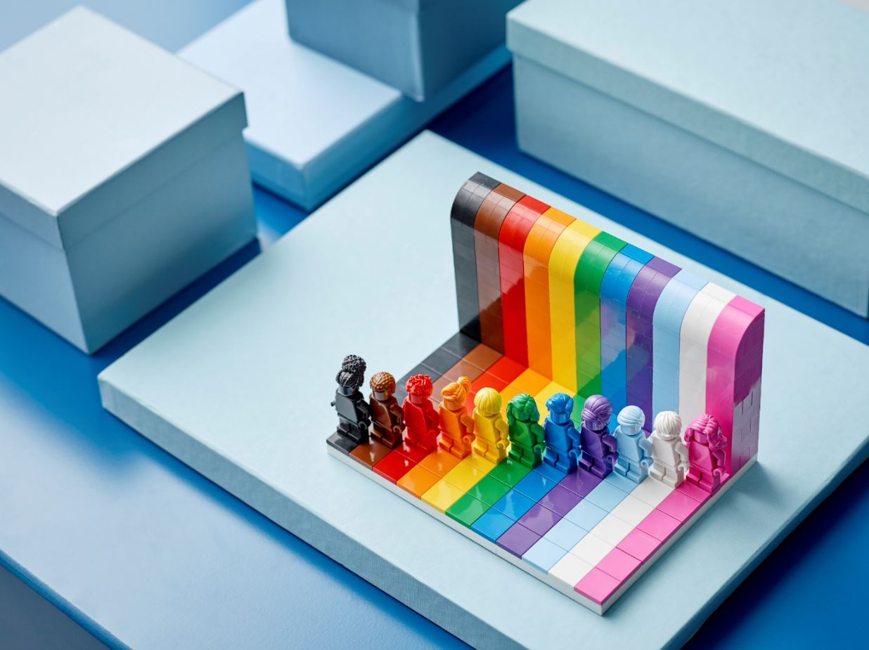 - A buildable display of 11 monochrome LEGO® minifigures, each with its own colour and hairstyle, against a background of corresponding rainbow stripes.