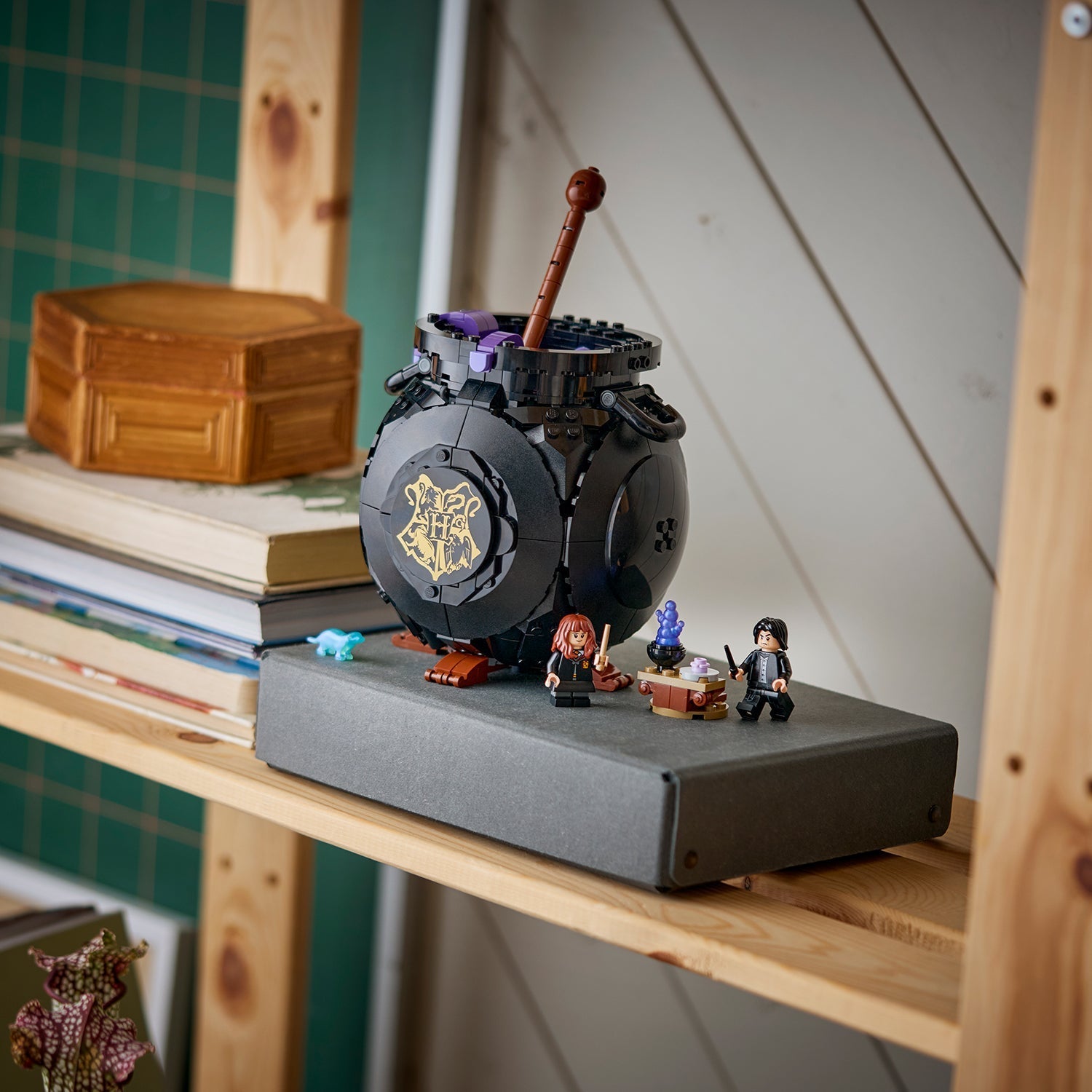 - SECRET CLASSROOM – Move the stirring stick and reveal the classroom with removable tables for easy play, a blackboard, potion bottles and LEGO® ingredients for Wolfsbane, Polyjuice and Love Potions