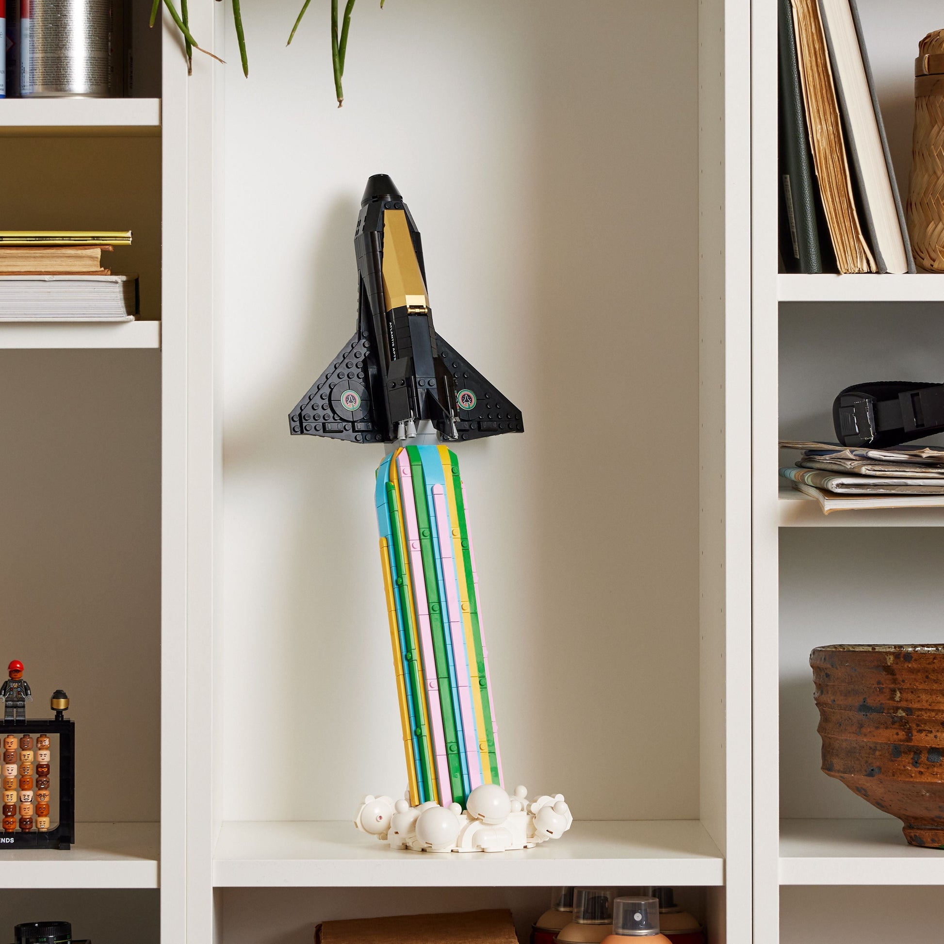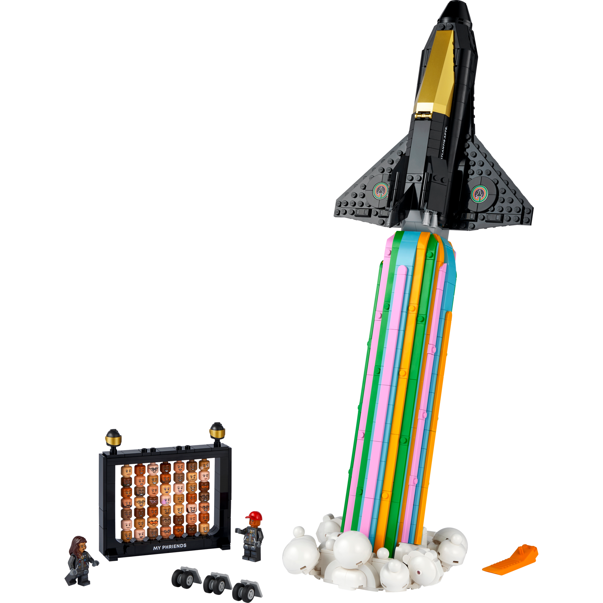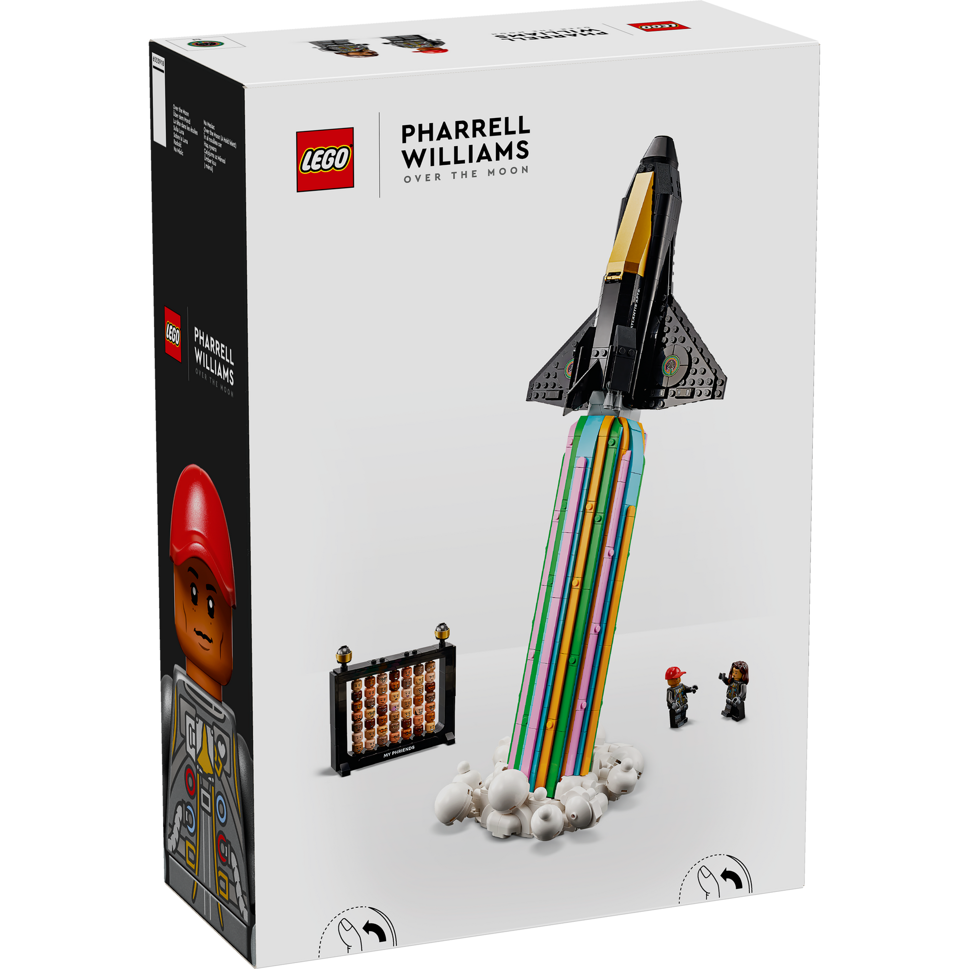 - What’s in the box – All you need to build a model space shuttle and colourful jet-stream display stand, plus Pharrell Williams and Helen Williams minifigures and 49 interchangeable character heads